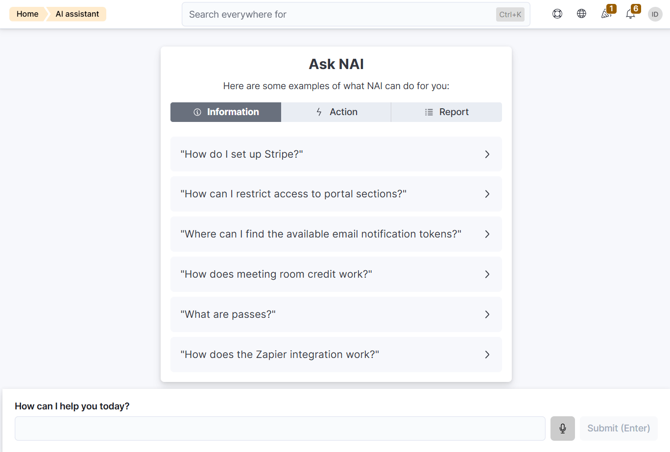 Information: Instantly answers questions about how Nexudus works, so operators can navigate the platform with ease.