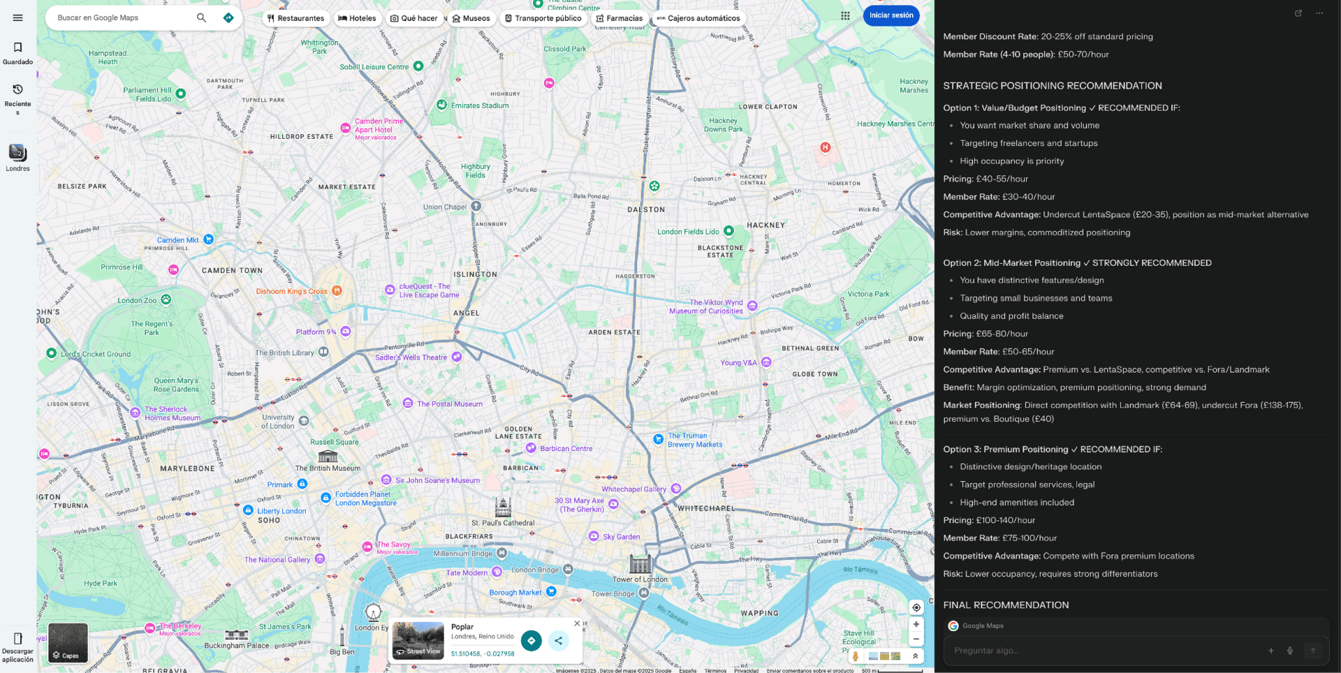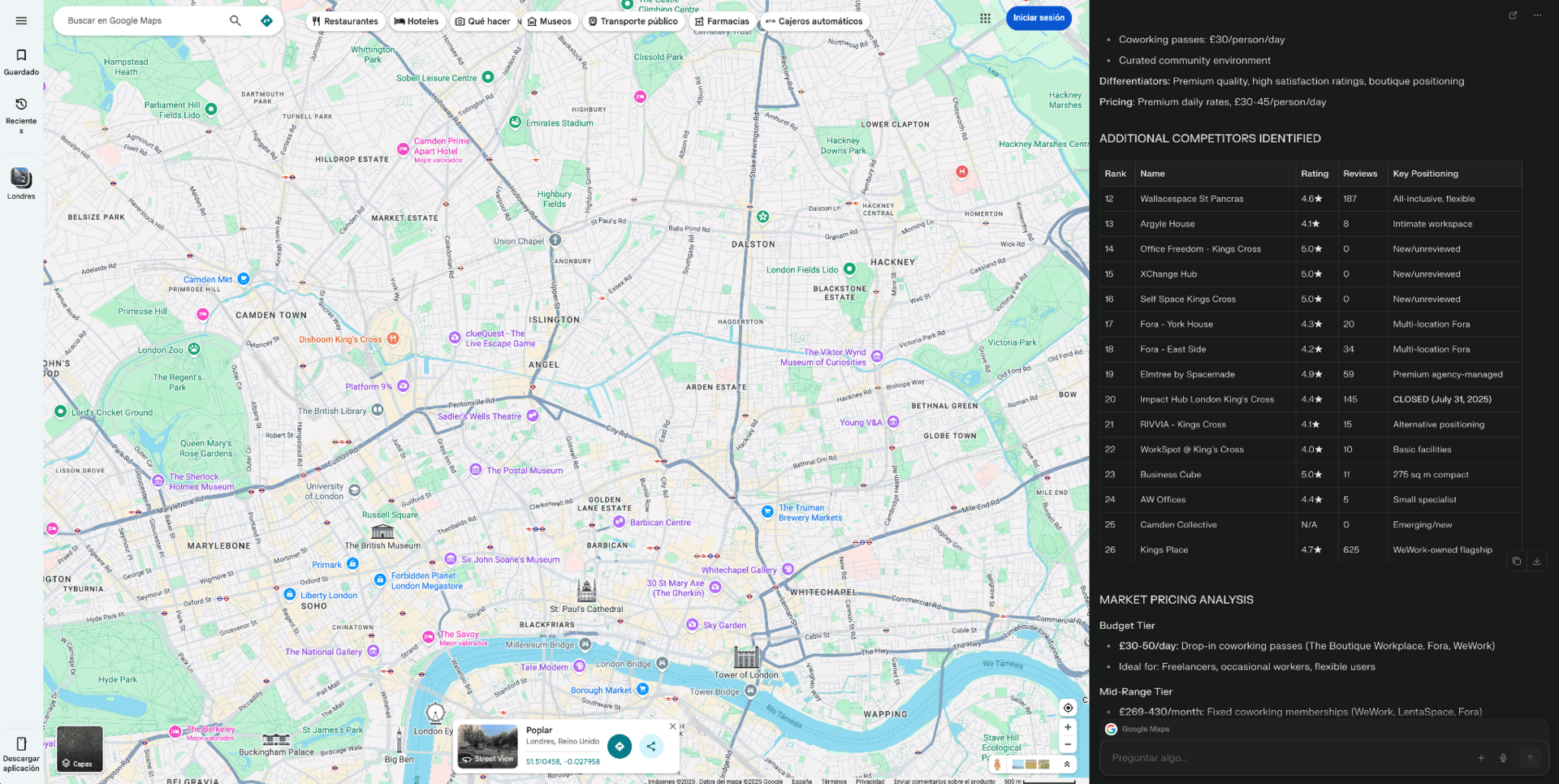 “I own a coworking brand located in central London (King's Cross). I want you to conduct a competitor research analysis to clearly identify the main value propositions of other coworking spaces in the same area. Open Google Maps so I can show you where my coworking space is located.”