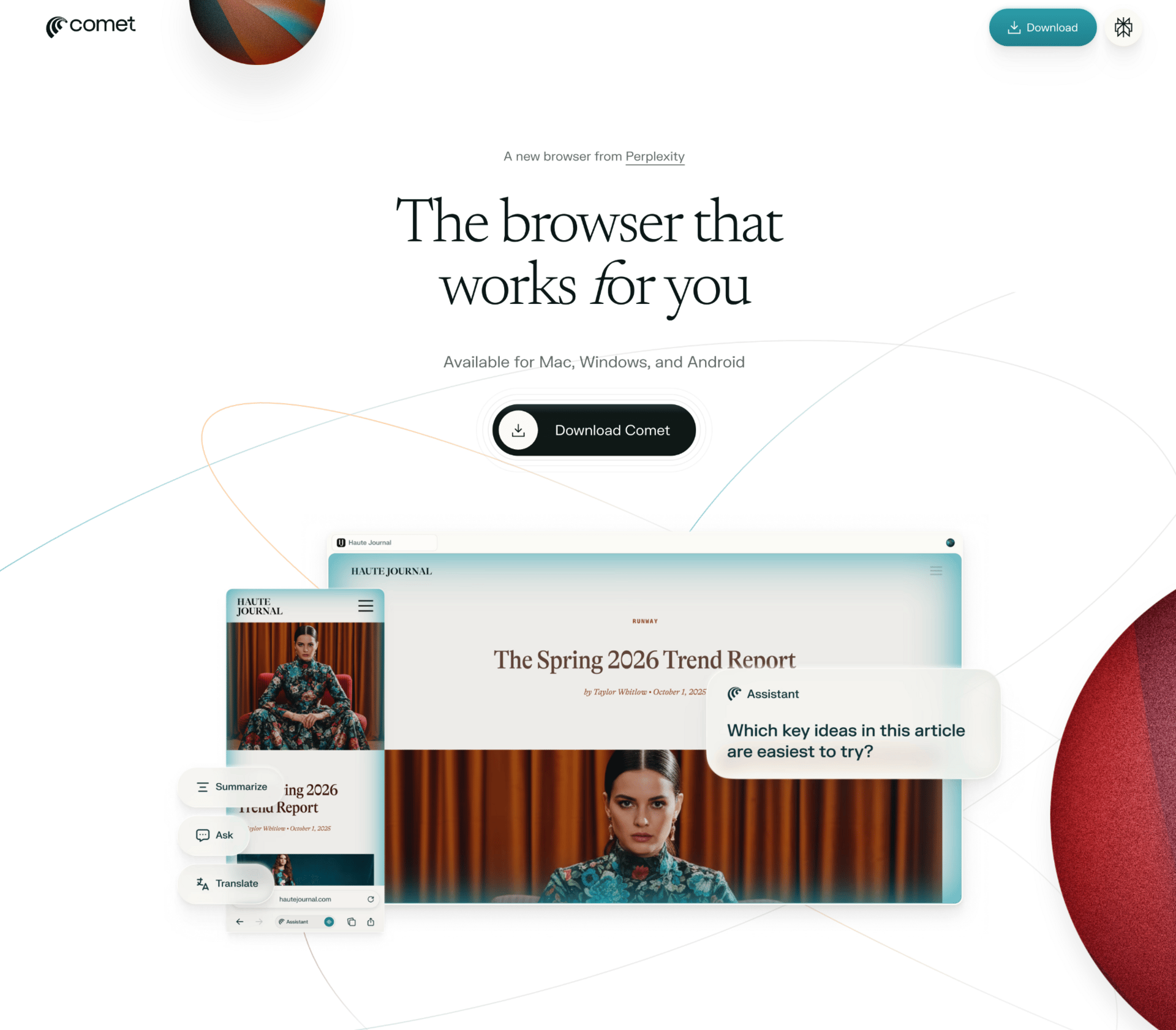 Built on Perplexity’s real-time search engine, Comet blends updated information with actionable capabilities, such as writing emails, preparing reports, or pulling industry data.Personal, private, and adaptive