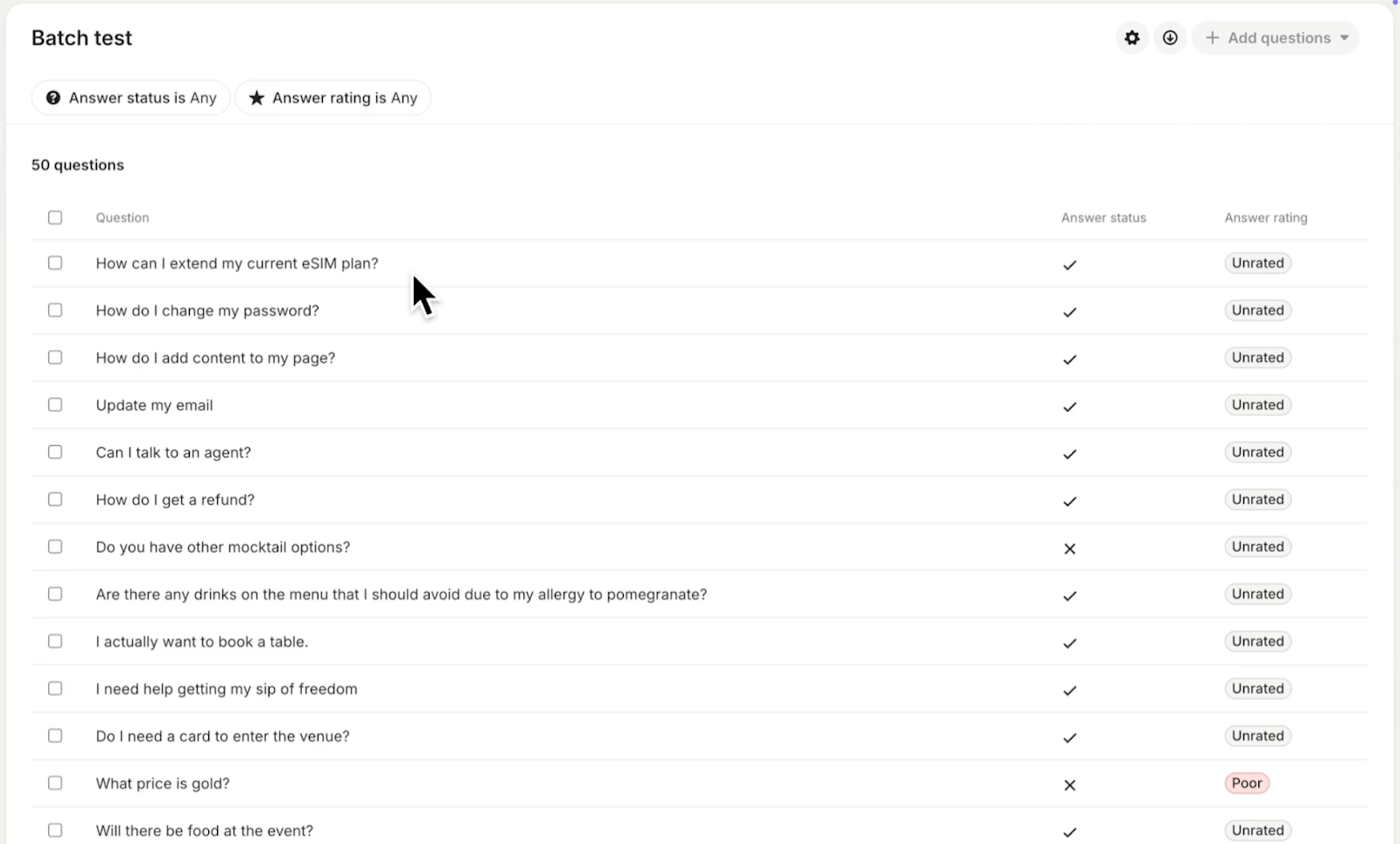 Fin enables you to simulate real customer questions and evaluate: