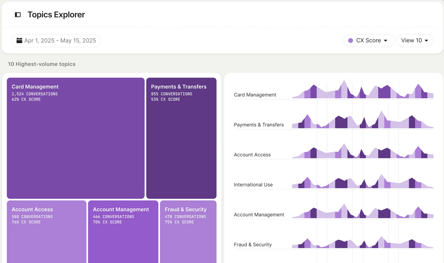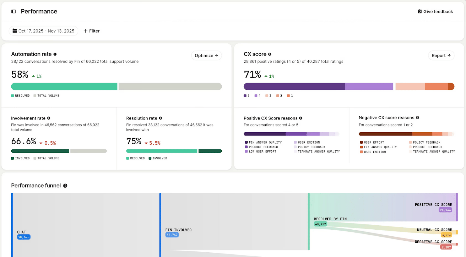 Provides a unified view of support handled by Fin and by teams, identifying patterns in question topics, recommendations, and improvement opportunities.