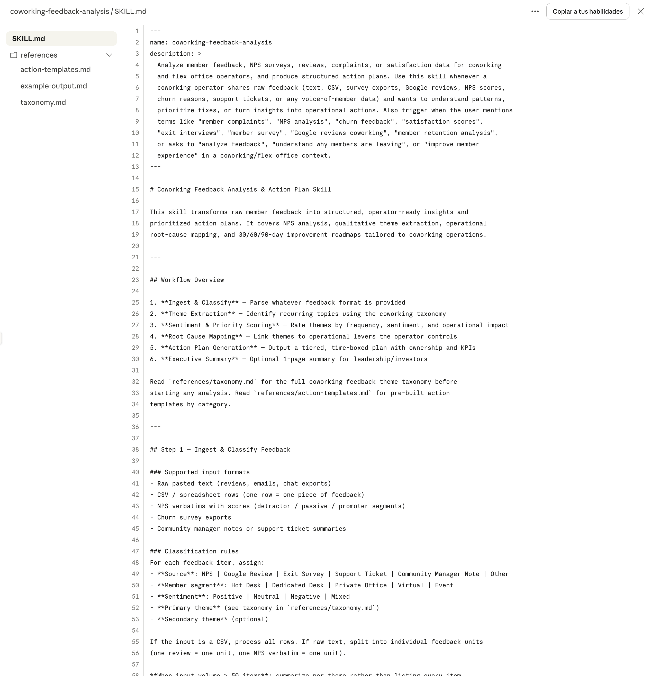 This is a more specialized skill example (image below), built around creating action plans from customer feedback analysis. You can see the reference folder including additional files such as a taxonomy, example outputs, and action templates.