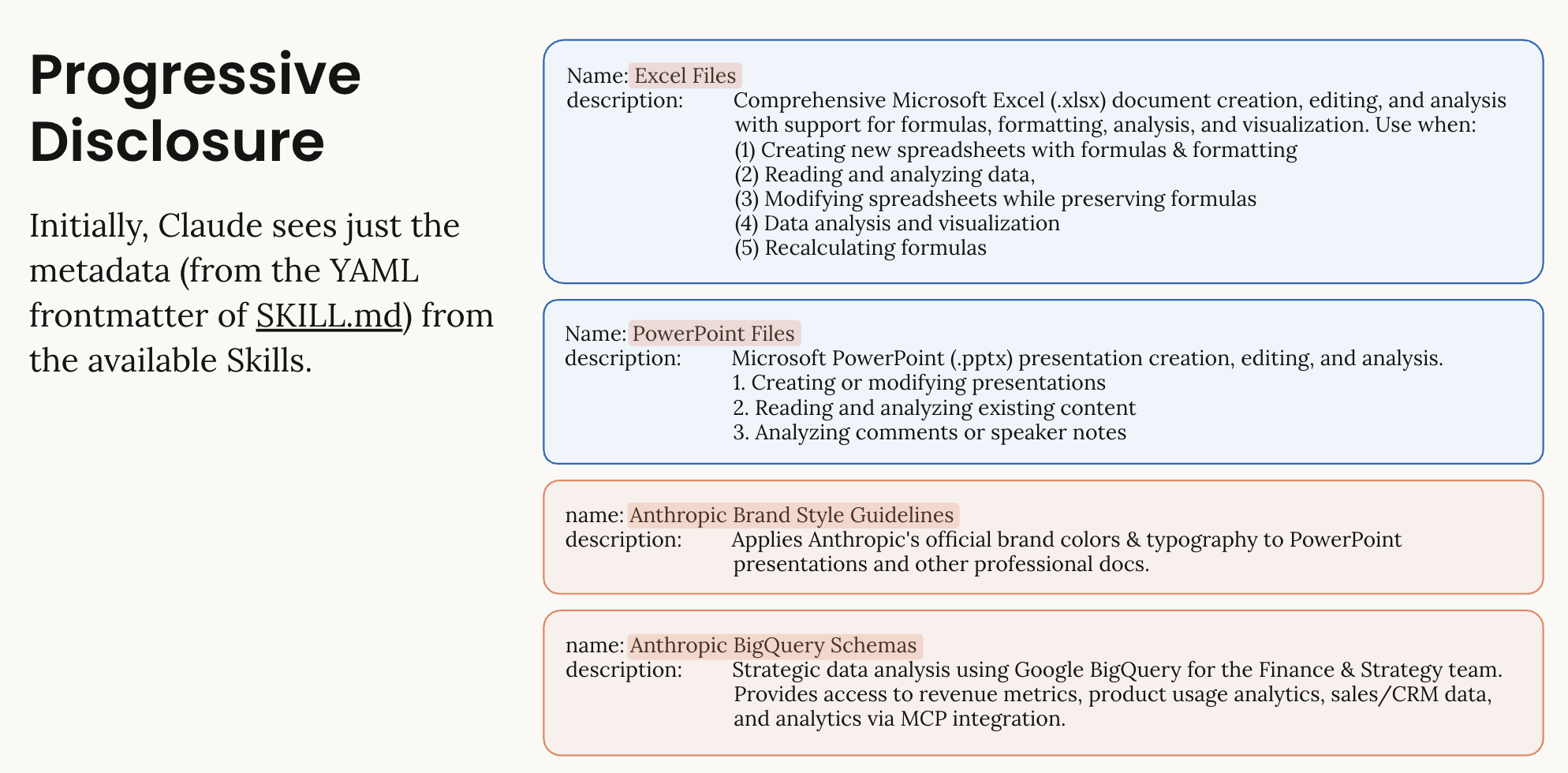 Skills improve consistency and performance across many specific tasks through progressive disclosure: metadata loads first, giving Claude just enough information to determine which Skills are relevant. It then loads the necessary details to complete the task and applies the corresponding instructions and available resources.