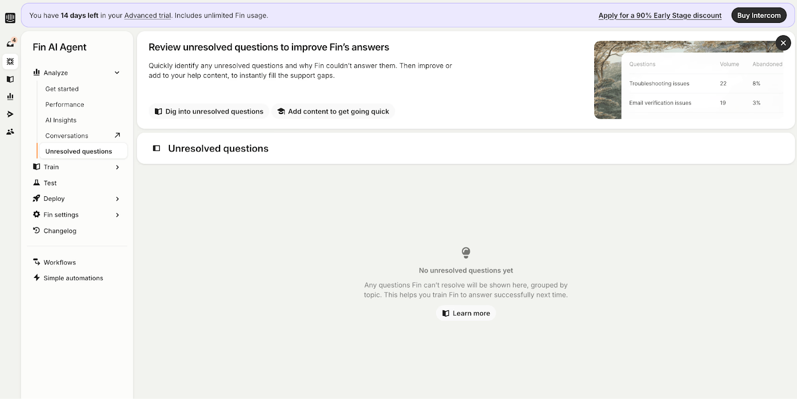 Identifies unanswered questions and explains why Fin was unable to respond.