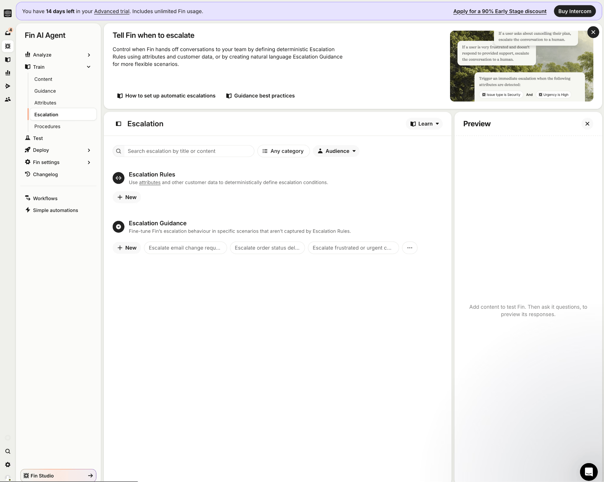 Definition of rules so that Fin escalates conversations to the team when necessary. Escalation to human teams can be done through deterministic rules based on attributes and customer data, or predefined scenarios.
