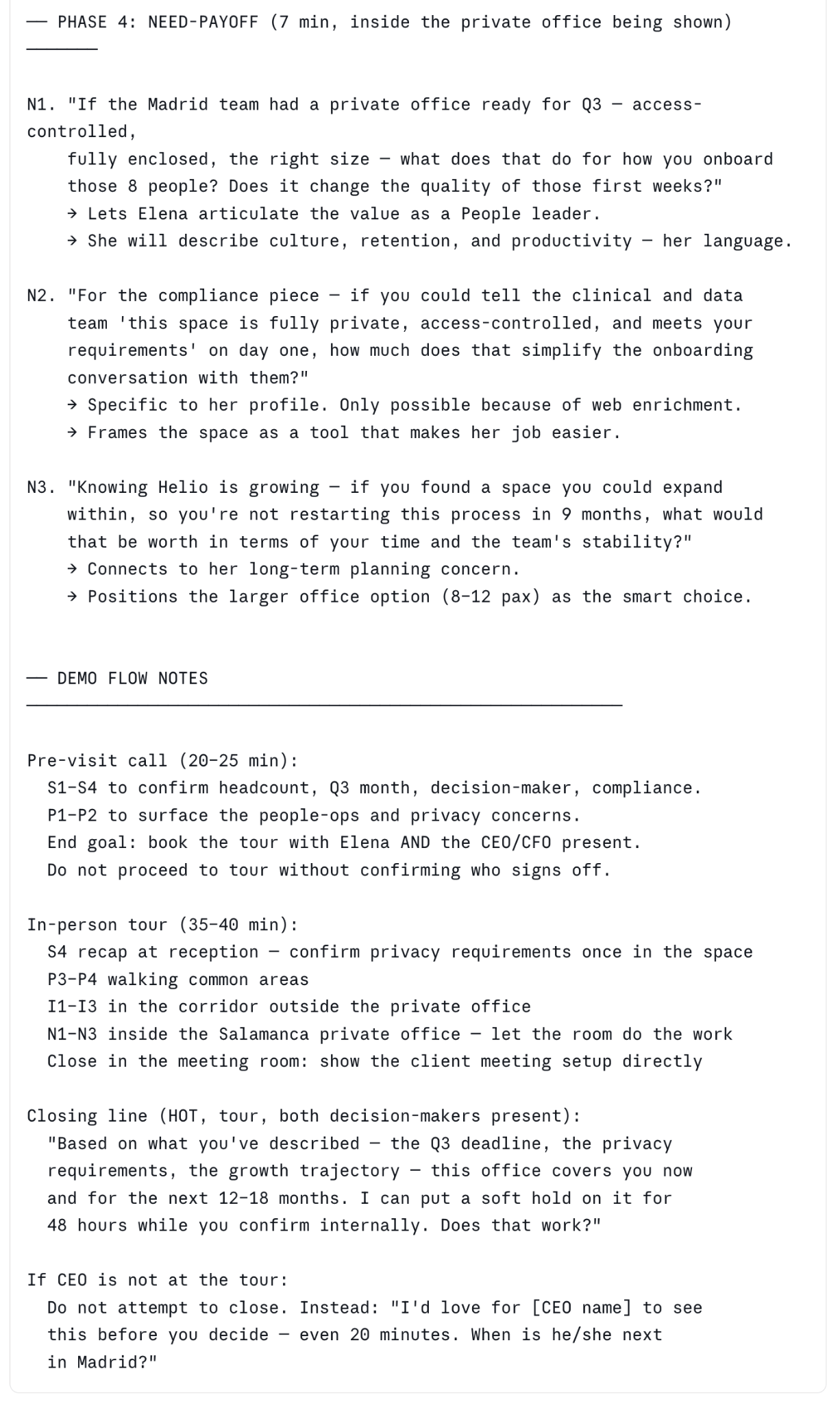 The demo script is a personalised SPIN-framework question guide built from the lead's enrichment data. The script is designed for real-time use, either on the pre-visit call or during the in-person tour.